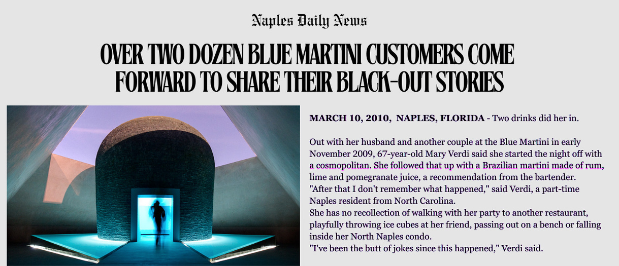 On July 31, 2009 the Blue Martini opened its doors in Naples, Florida. Hordes of wealthy retired happy hour enthusiasts descended upon its nouveau riche splendor and began slurping their way through an extensive menu of sweet and tropical drinks; often blue in color, served in aggressively huge martini glasses (which was the style at the time). Apparently unable to discern a difference between an overshaken Manhattan from their country club and these enormous vats of booze and sugar, mass blackouts soon descended upon the community. Then the outcry and accusations. The only logical explanation was that Blue Martini was drugging everyone. Why would bartenders waste perfectly good drugs on 10% tipping ass senior citizens? Nobody knows.