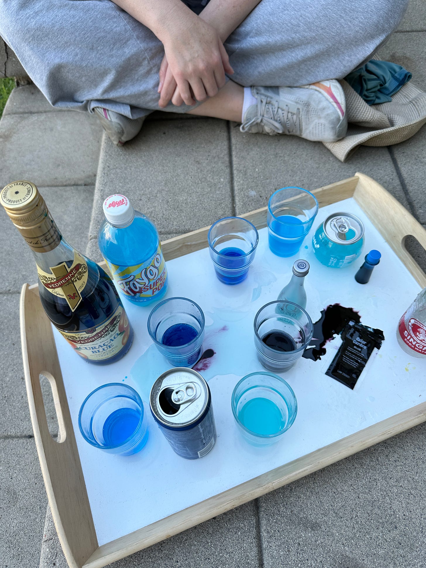 Committed to the bit, I rummaged through my hoarder stash of drinks and pulled out every blue beverage plus natural/unnatural dyes to mix with bubble water. My pal Holly came over to help taste through them.